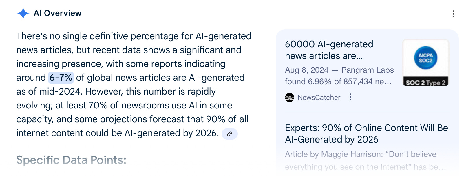 Google screen grab of AI-generated answer on Google.com to how many news stories are AI-generated.